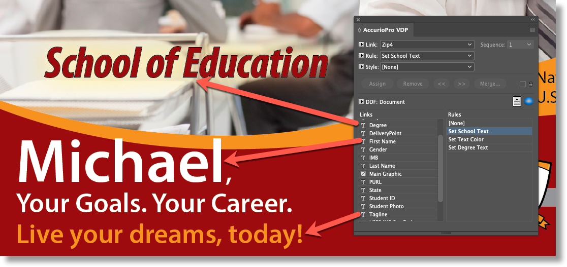 Creating a variable document with AccurioPro VDP is very easy to do because the setup process utilizes a custom floating panel, with all of the main features accessible via the panel fly-out menu. Of course this means that you never need to leave the InDesign application! Just select the objects you wish to make variable, and click a button. There is no programming language to learn, and most importantly your VDP designs are completely unrestricted – every feature supported by Adobe InDesign is also supported by AccurioPro VDP, including type-on-a-curve, runarounds, multi-page composition, drop caps, transparency effects, Pantone® colors, and much more.