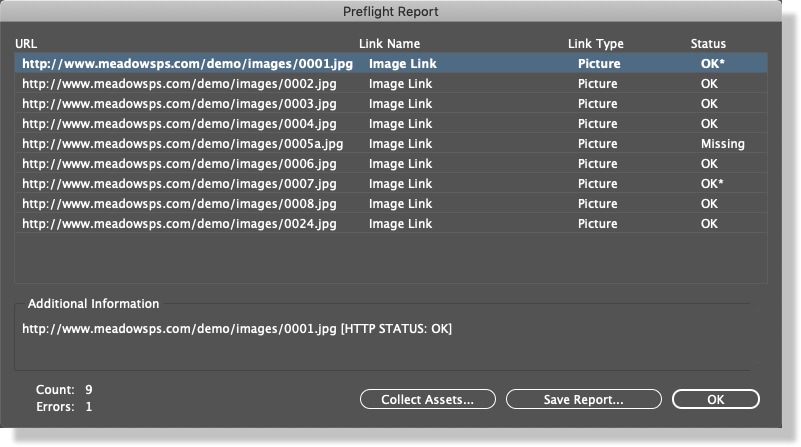 References to URL images are also fully supported by the AccurioPro VDP preflight feature. When you run a preflight session, the software will check the availability of all URL referenced images, and provide the status in the report. Image files that have already been downloaded into the local cache will be identified in the preflight list, as well as any URL images that may be missing. If you wish to pre-download a local copy of any URL files, the preflight collect feature takes care of that automatically.